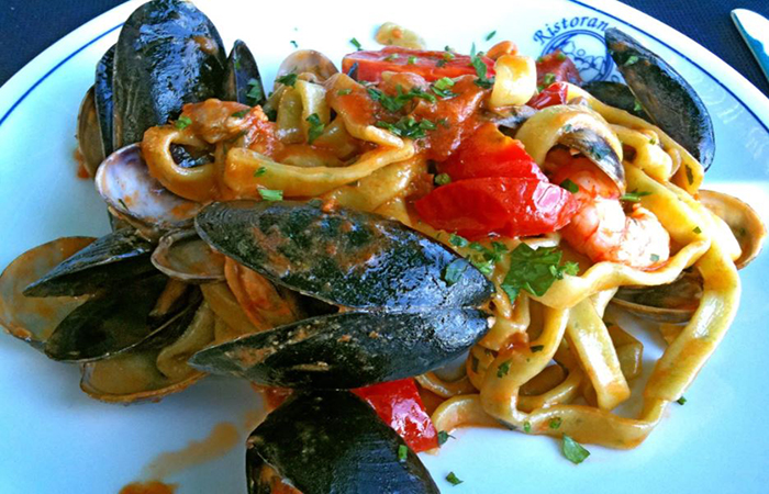 Scialatielli ai frutti di mare پاستا همراه غذای دریایی است که با غذاهای دریایی محلی تازه و scialatielli درست می شود – یکی از انواع پاستا شبیه لینگوئینی از منطقه آمالفی ست. این غذا دارای طعم های سنگین ریحان و پنیر پکورینو و همچنین میگوی تازه ، گوش ماهی و صدف است.