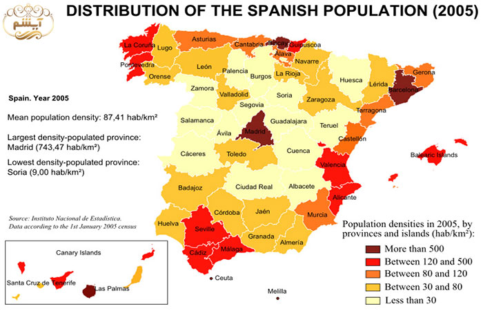اسپانیا سومین کشور بزرگ در اروپا است، اسپانیا دارای مساحت504782 کیلومتر مربع (194897 مایل مربع) است. در مقایسه، منطقه اشغال شده توسط اسپانیا کمی بیش از دو برابر اندازه ایالت اورگان آمریکا است .جزایر اسپانیا شامل جزایر بالئارس (جزایر بالئارس) در دریای مدیترانه غربی و جزایر قناری (جزایر قناری) در اقیانوس اطلس غرب مراکش است؛ هر دو گروه از جزایر به عنوان بخش جدایی ناپذیر از اسپانیا محسوب می شوند.