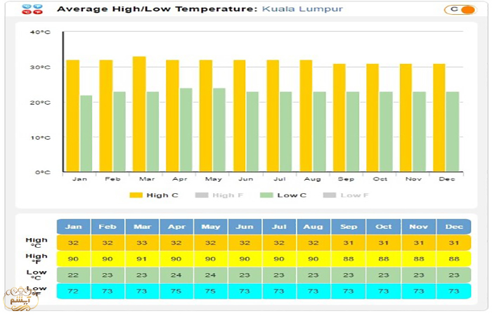 کمترین و بیشترین دما سالانه کوالالامپور
