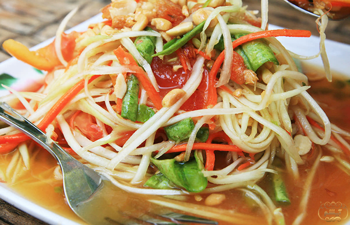 سام تام، سالاد تند پاپایا از شمال شرق تایلند می آید، اما آن به سراسر کشور رسیده. تفاوت های منطقه ای غذایی در تایلند ممکن است در مواد تشکیل دهنده آن باشد، به معنای مقیاس شیرین یا ترش بودن است و این امر تا حد زیادی بین رستوران ها متفاوت است. وجه مشترک همه دستور العمل غذایی است، پاپایا سبز و سالم از مرغ کباب شده و توده های برنج چسبناک درست میشود.