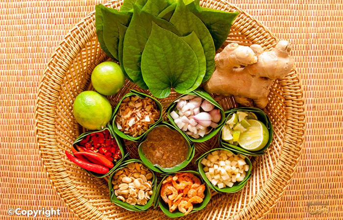 یک وعده عالی با ترکیبی از برگ های تازه betal ، شربت شیرین، فلفل قرمز یا سبز تازه ، زنجبیل خرد شده، سیر خرد شده، آهک خرد شده، میگو کوچک و نارگیل رنده شده بو داده.