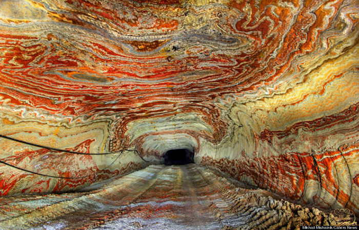 معادن نمک سورئال در یکاترینبورگ روسیه قرار گرفته است. در قسمت پایین شهرستان صنعتی این پدیده ی طبیعی و خیره کننده کشف شده است. و از ویژگی های زیبای معدن نمک قدیمی راه راه و رنگارنگ بودن آن است که نتیجه ی لایه های رسوبی کارنالیت است که تزیین دیوار راهروها را به این صورت شکل داده اند. جالب است بدانید که تنها بخش کوچکی از معدن امروزه استفاده می شود، با این حال این معدن بر روی عموم برای بازدید باز نمیباشد مگر اینکه از طرف دولت روسیه برای بازدید از این معدن اجازه ای صادر شده باشد. این تصویر خیال انگیز زیبا از مواد معدنی رنگی 200 متر (650 فوت) زیر سطح زمین یافت میشود از همین رو قطعا برای بازدید عموم باز نیست اما عکاس های به نامی نظیر میخاین میشانیک عکسهای زیبایی از این معدن زیبای روسی را به نمایش گذاشته است.