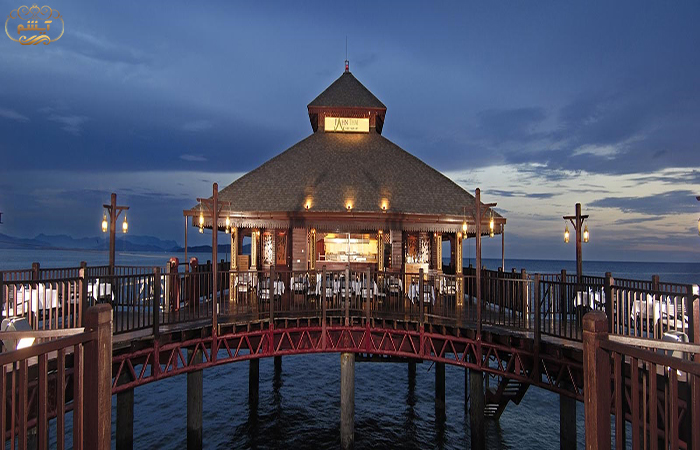 هتلی مجلل و بسیار زیبا و باشکوه که فضای درونی آن بسیار با شکوه و دارایی تجملات فراوان است پوشیده شده از فضاهای آبی اطراف اش