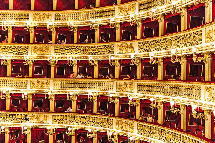 Real Teatro di San Carlo یکی از بزرگترین تئاترهای اروپا و یکی از خانه های برتر اپرای ایتالیا ، توسط پادشاه چارلز بوربون و در مجاورت کاخ سلطنتی وی ساخته شد. این بنا در سال 1737 به اتمام رسید و در عین حال که قدیمی ترین سالن اپرای فعال در اروپا بود ، الگوی خانه های اپرا در همه جا بود. شش طبقه لژ تزئین شده به همراه تزئینات داخلی ، فضای داخلی را احاطه کرده است ، که توسط لژ سلطنتی با شکوه و تزئینات بی نظیر آن برجسته شده است.