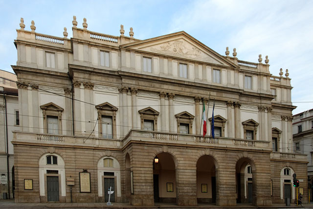 تئاتر آلا اسکالای میلان یکی از بزرگترین و معتبرترین تئاتر ایتالیا است. در 3 اوت 1778 با اپرای "L'Europa" اثر آنتونیو سالیری افتتاح شد. این بنا به دستور ملکه ماریا ترزا اتریش توسط معمار نئوکلاسیک جوزپه پیرمارینی بر روی خرابه‌های تئاتر دوکال و کلیسای سانتا ماریا آلا اسکالا ساخته شد و برای ساخت تئاتر تخریب شد. شکل سالن شبیه نعل اسبی است و با تزئینات نئوکلاسیک مزین شده است. برای اطمینان از آکوستیک بهتر، یک طاق چوبی تقریباً مانند یک تخته صدایی طبیعی انتخاب شد. در بالای پروسنیوم یک ساعت قرار دارد که ساعت و دقیقه را توسط دو چهره زن در نقش برجسته نشان می‌دهد. از سال 1812، با روسینی و بسیاری از اسامی معتبر دیگر، تئاتر آلا اسکالا به خانه ملودرام و سپس باله تبدیل شد. در 16 اوت 1943، بمباران میلان را هدف قرار داد و سقف، طاق و دیگر مناطق تئاتر را تخریب کرد. بلافاصله بازسازی انجام شد، از جمله نصب نسخه‌ای از لوستر باشکوه قرن نوزدهمی که تخریب شد و از طاق آویزان است و دارای 383 لامپ است. امروزه رنگ‌های غالب عمدتاً از طلا و عاج هستند. یک سیستم پیچیده از راه پله‌ها با چندین پرواز، معروف به "پله‌های پلکانی"، سرسرا را با راهروهای منتهی به جعبه ها متصل می‌کند. در سال 2000 ، طرح اولیه پیرمارینی توسط معمار سوئیسی ماریو بوتا تمدید شد و امروزه نیز انجام شده است، سطح جعبه و گالری با 2030 تماشاگر.