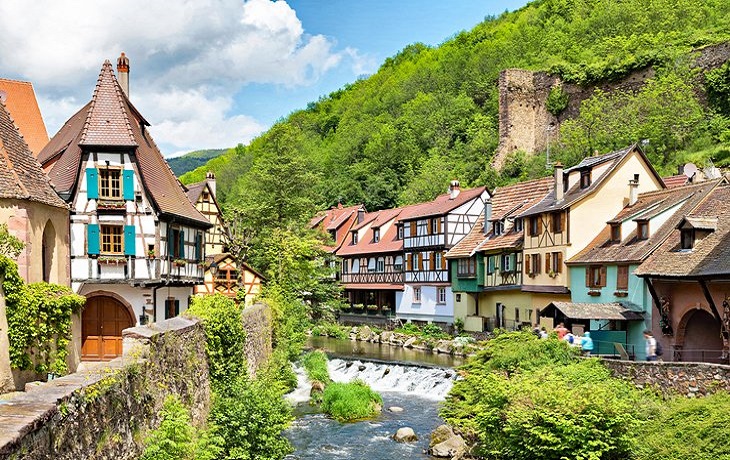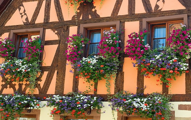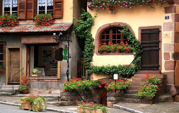 Riquewihr که نمونهای از شهرهای آلزاس است، دارای ساختمانهای نیمهچوبی تاریخی بسیاری است که با بالکنهای گلدار تزئین شدهاند. علاوه بر جذابیت، این روستا دارای میدانهای عمومی دلپذیر است که با فوارهها تزئین شدهاند.
