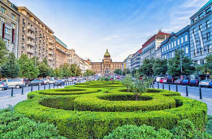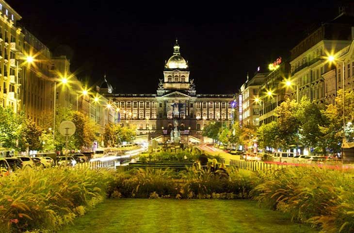 میدان Wenceslas به نام قدیس حامی بوهمیا، که مجسمه او در اینجا دیده می شود، در قرن چهاردهم در زمان سلطنت چارلز چهارم به عنوان بازار اسب ساخته شد و از آن زمان به یکی از مهم ترین فضاهای عمومی شهر تبدیل شده است که هنوز برای تظاهرات و جشن ها به طور یکسان استفاده می شود.