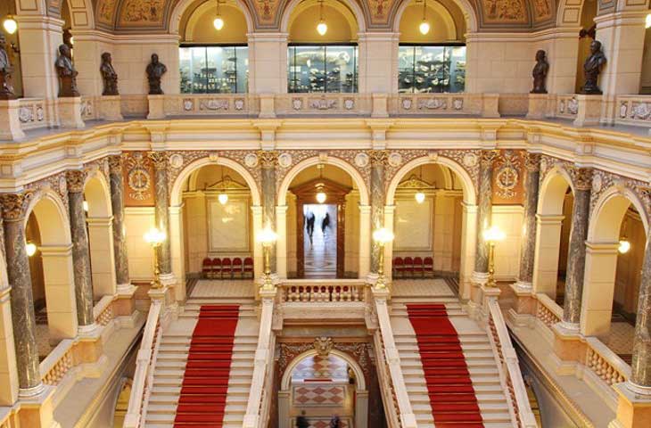 فضای داخلی به همان اندازه چشمگیر است و شامل بسیاری از پنجره های شیشه ای رنگارنگ و نقاشی های مهم است. در حالی که تورهای راهنما به زبان انگلیسی در دسترس هستند (از جمله فرصتی برای دیدن اتاقهای تشریفاتی بسته)، یکی از بهترین راهها برای لذت بردن از این مکان دیدنی، شرکت در کنسرت یا نمونهبرداری از کافهها، رستورانها، و بوتیکفروشیهای لوکس آن است.