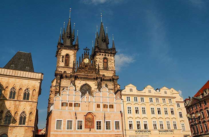 یکی از شناخته شده ترین ساختمان های پراگ، کلیسای بانوی ما قبل از تین (Kostel Matky Boží pred Týnem) است که اغلب به اختصار به کلیسای Týn گفته می شود. بدون شک برای گلدسته های دوقلوی 80 متری آن که در دو طرف ساختمان قرار دارند (هر کدام از چهار گلدسته کوچکتر پشتیبانی می کنند)، ورودی اصلی آن از طریق یک گذرگاه باریک از کنار خانه هایی است که نمای آن را پنهان کرده است.
