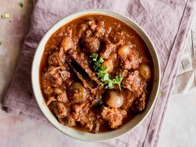 استیفادو یک خورش گوشت گاو سنتی یونانی است که با گوجه فرنگی، پیاز، دارچین، سرکه یا شراب قرمز و انواع ادویه ها و سبزی ها پخته می شود. به طور سنتی، این غذای یونانی یا با برنج، چیپس سیب زمینی ، هیلوپیت (پاستای تخم مرغ)، یا پاستا ارزو/کریتاراکی سرو می شود. برای روزهای سرد زمستان، آن را با پوره سیب زمینی برای یک غذای دلچسب و گرم سرو کنید.