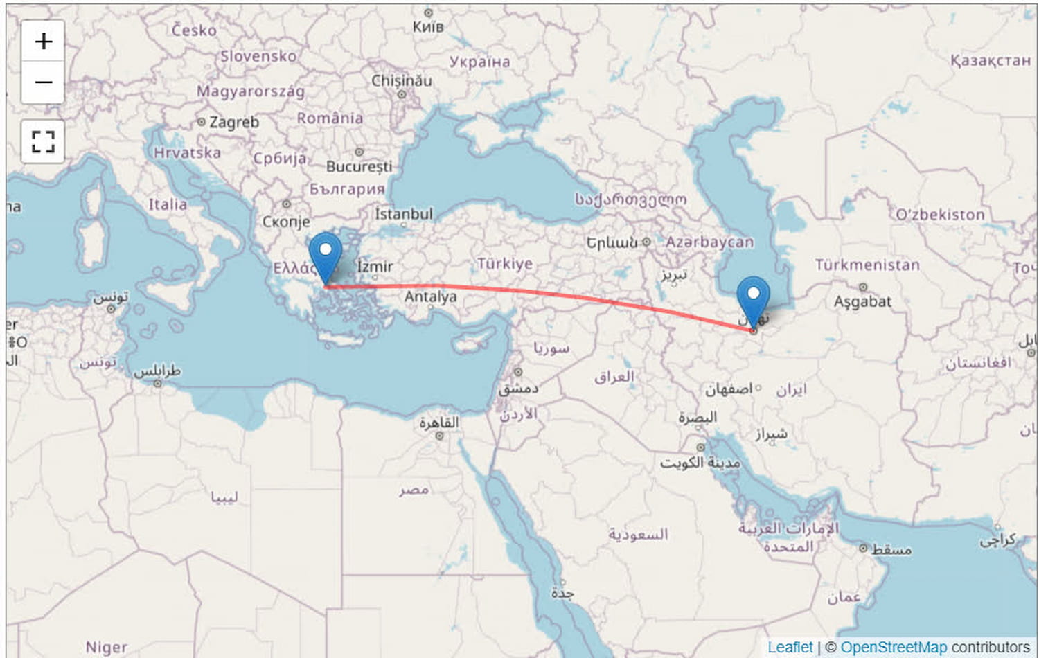 نقشه مسیر کوتاهترین پرواز بین فرودگاه بینالمللی مهرآباد (THR) و فرودگاه بینالمللی آتن (ATH) را در ادامه مشاهده کنید: