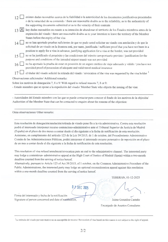 در زیر میتوانید صفحه اول و دوم یک نمونه برگه ریجکتی سفارت اسپانیا را مشاهده کنید: